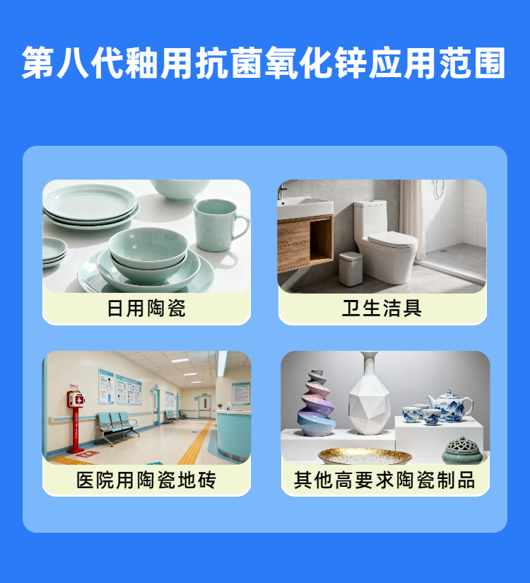 本產(chǎn)品是一款專為日用陶瓷(如餐具、杯盤)和 衛(wèi)生潔具(如馬桶、洗手盆、浴缸、浴室磚)以及公共及醫(yī)療設(shè)施(如醫(yī)院用陶瓷、學校食堂餐具)等釉面陶瓷制品設(shè)計的高性能功能性原料。它采用獨特的鋅基抗菌技術(shù),在提供優(yōu)異抗菌性能的同時,兼具增白與助熔效果,旨在為客戶提供一種安全、高效、經(jīng)濟且易于應(yīng)用的基礎(chǔ)釉料健康升級解決方案。
